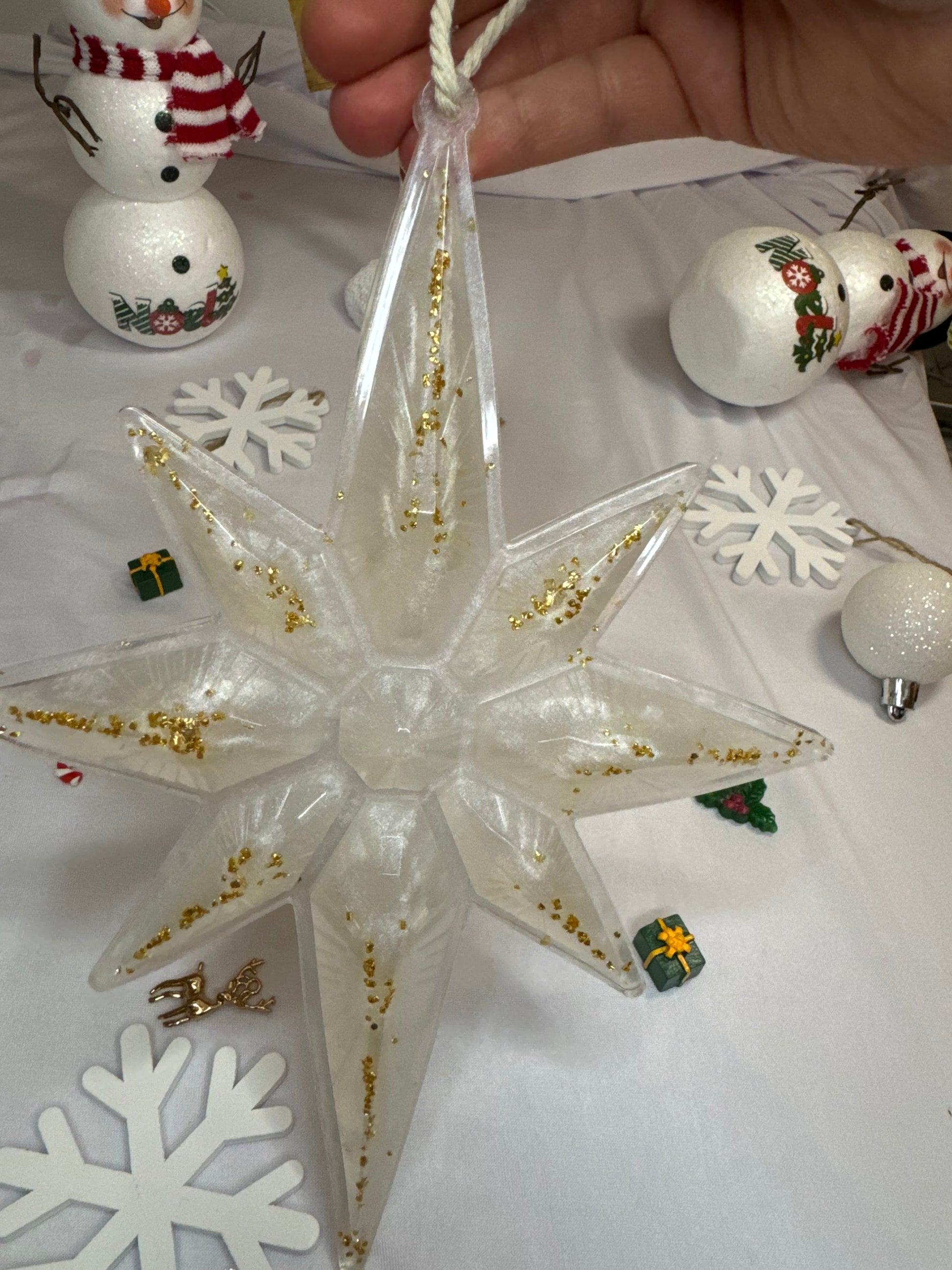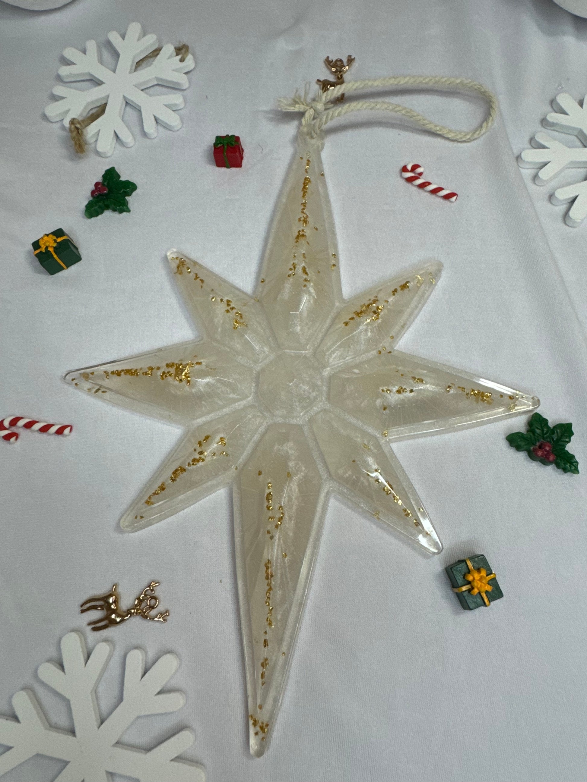 Éblouissante suspension en forme de grande étoile en blanc, ornée de petites perles dorées ✨. Parfaite pour apporter une touche scintillante à votre décoration de Noël ! 🎁✨