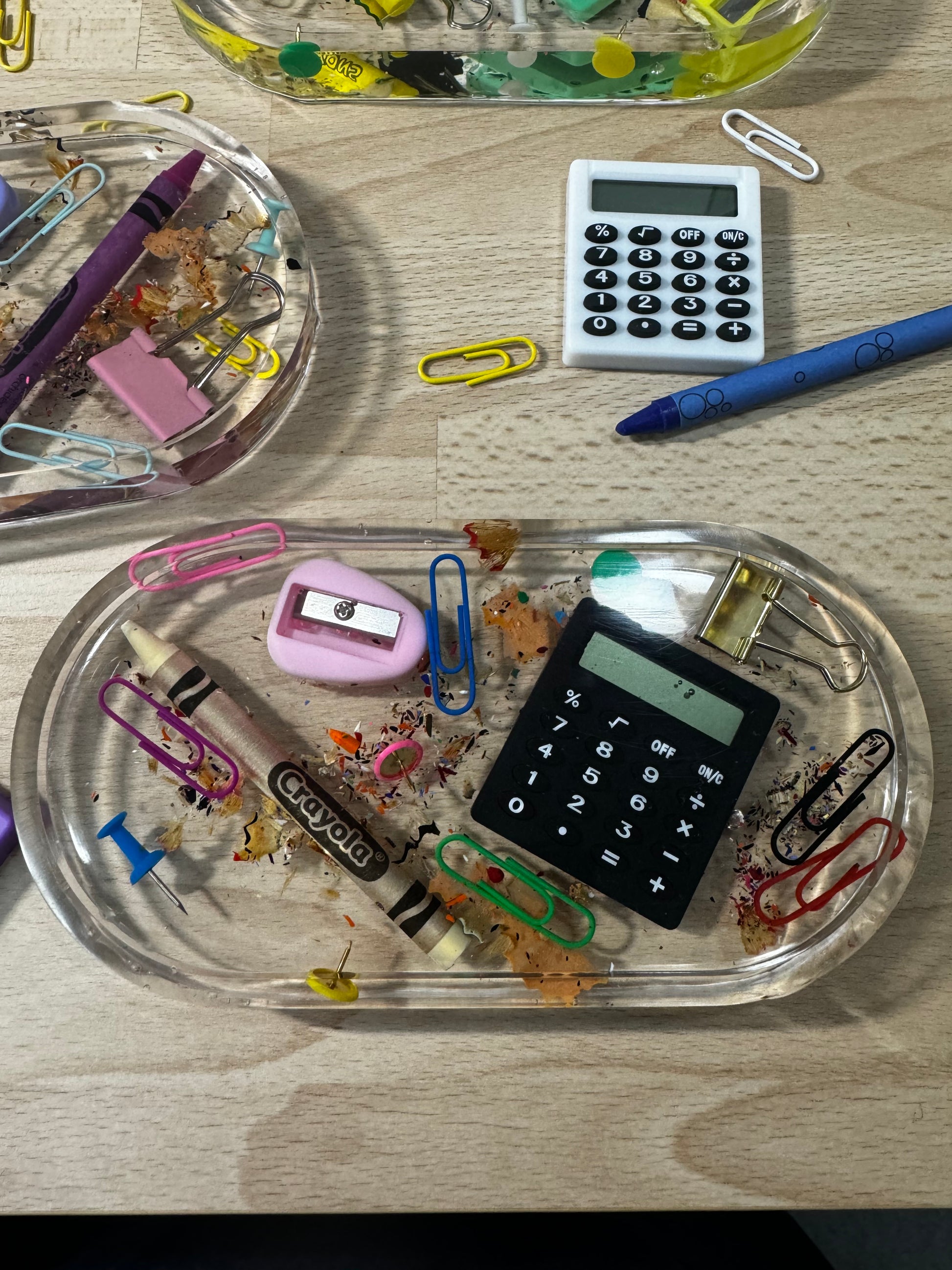 - Crayons, trombones, copeaux de taille-crayon, et mini-calculatrice.